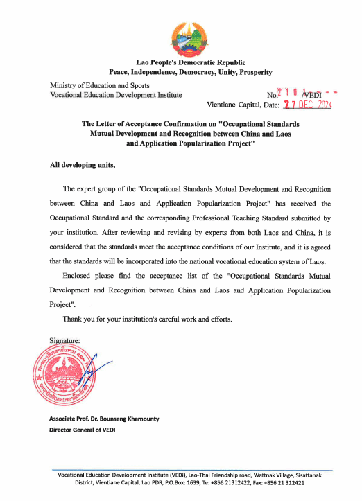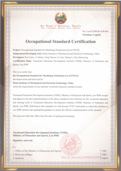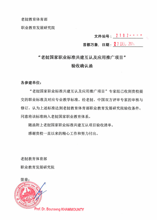 目前,我系已严格遵循“老挝国家职业标准共建互认项目”的要求,顺利完成上述职业标准及配套教学标准的建设工作,并顺利通过老挝教育体育部技术与职业教育司的验收。这标志着我系在职业标准国际化方面迈上了新的台阶。