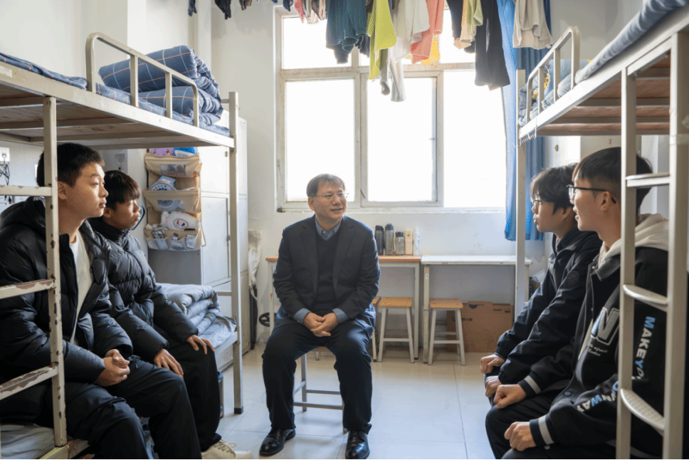 在宿舍,王彦林与诚意楼南楼409宿舍的同学们亲切攀谈,详细询问了他们的学习、生活及家庭情况,耐心解答困惑,他叮嘱同学们要注意用电安全、坚持体育锻炼、养成良好作息,建立和谐友好的人际关系,以积极心态和良好面貌适应大学校园生活。期间,与学生互留联系方式,时刻保持联系。
