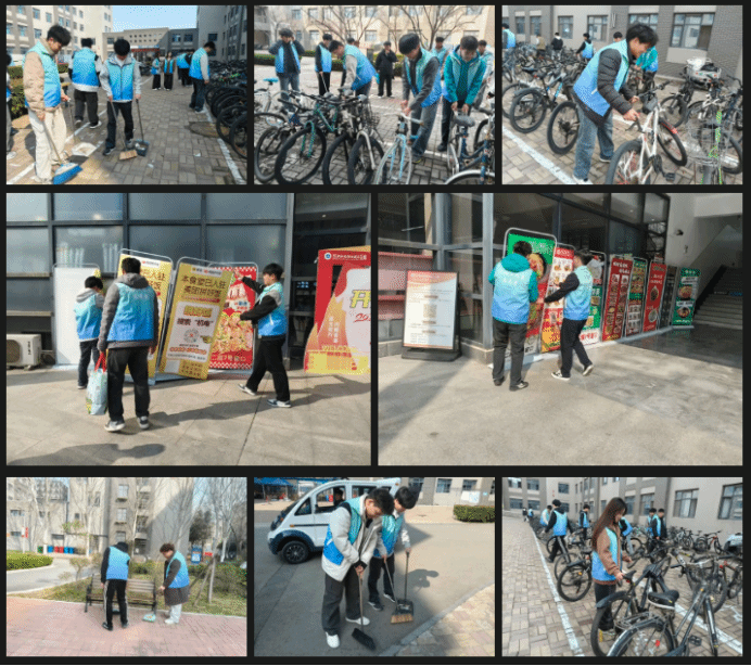 我系志愿者们在负责人的带领下,迅速明确了各自任务与分工。有的负责清扫路面落叶杂物,有的将被风吹倒的展示栏扶起,还有的规整乱停乱放的单车,大家齐心协力为校园净美工作出力,活动现场洋溢着忙碌而有序的温暖氛围。